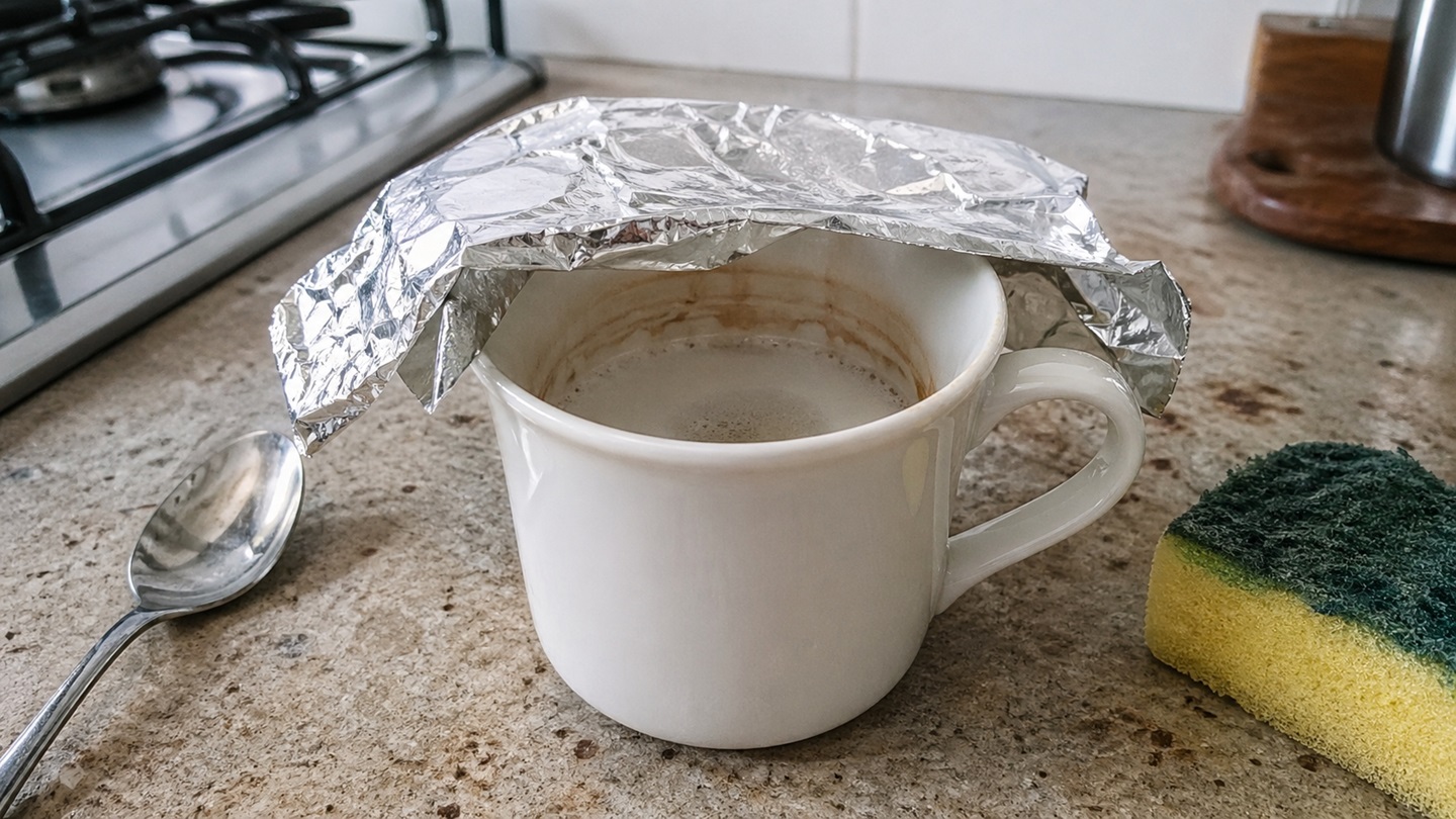 Per un periodo ho pensato che servisse un prodotto specifico. Poi mi sono fermata, perché era assurdo comprare qualcosa solo per una tazza macchiata di tè. Così ho provato un sistema molto semplice, usando una cosa che avevo già in cucina: un pezzo di carta stagnola.